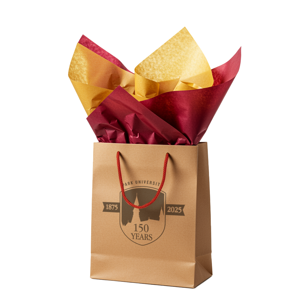 Sourced craft paper goodie bags to be printed with one color 150 logo. Also sourced tissue paper in school colors.